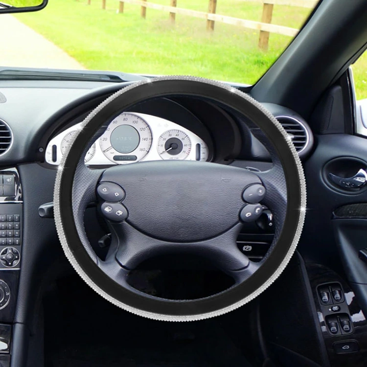 This Diamond Steering Wheel Cover combines luxury and functionality. Made with high-quality PU leather and sparkling rhinestones, it complements any vehicle. Anti-slip, sweat-proof, and easy to install, it fits most standard steering wheels. It is ideal for drivers who want both protection and style.