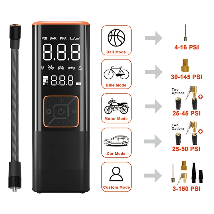 Pressure units: PSI, KPA, BAR, KG/CM², and four preset inflation modes. You can set the pressure of the four preset modes according to your vehicle. This air pump is suitable for: