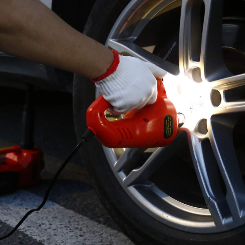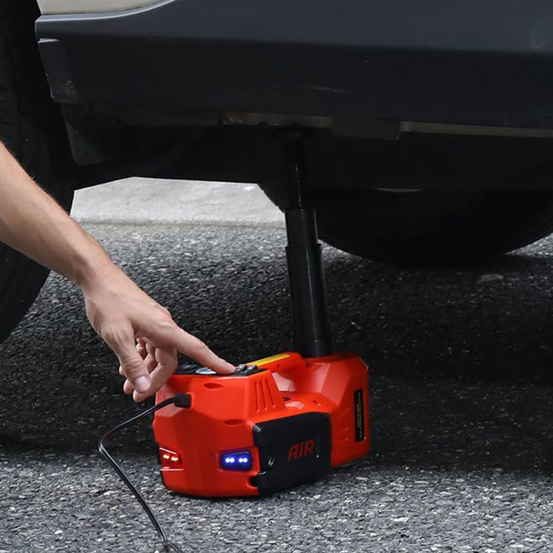 Unlike single-purpose jacks, this kit integrates lifting, inflation, nut removal, and lighting—eliminating the need for separate tools. The front LED light illuminates work areas, while the rear flashing light warns oncoming traffic.