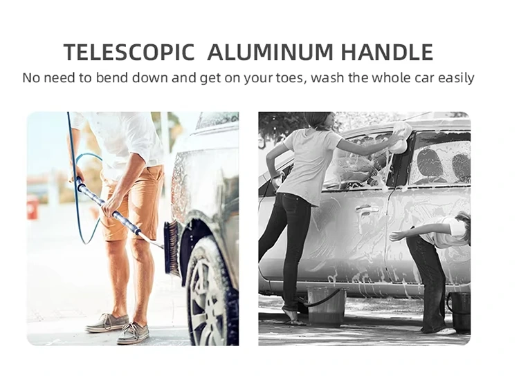 The Telescopic Car Washing Mop, called a Water Flow Brush, makes car washing easier and more efficient. There is no need to bend over or carry a water bucket—connect a hose to the top of the handle, and water flows directly through the brush. The telescopic aluminum handle extends to reach high areas and can be fully detached for close-up cleaning of car surfaces and windows. The handle also rotates 180 degrees, allowing you to adjust the cleaning angle for better coverage and convenience.